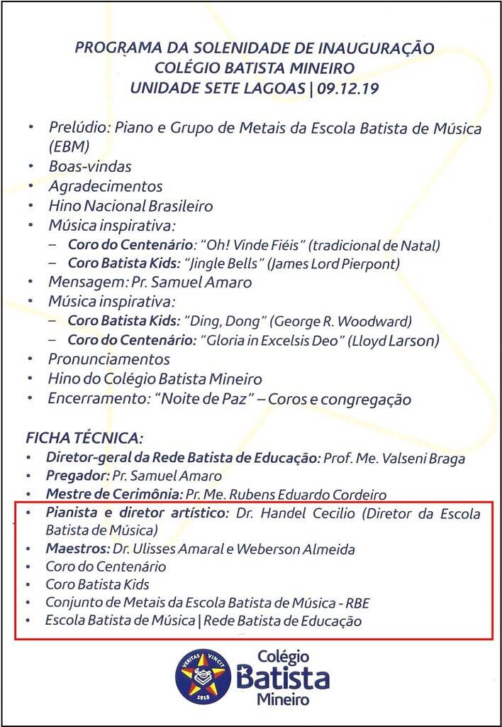- Pianista e diretor artístico: Dr. Handel Cecilio (Diretor da Escola Batista de Música)