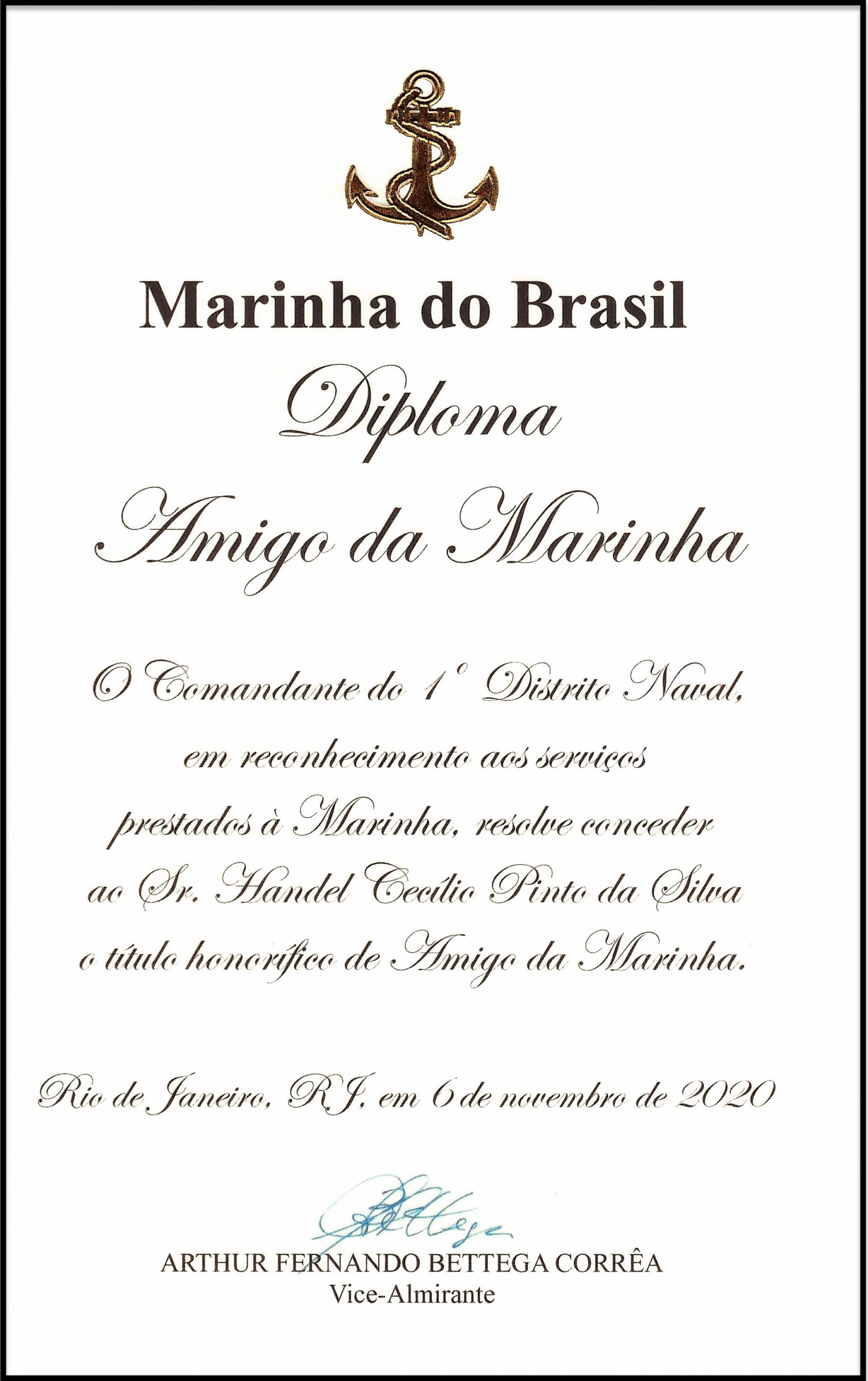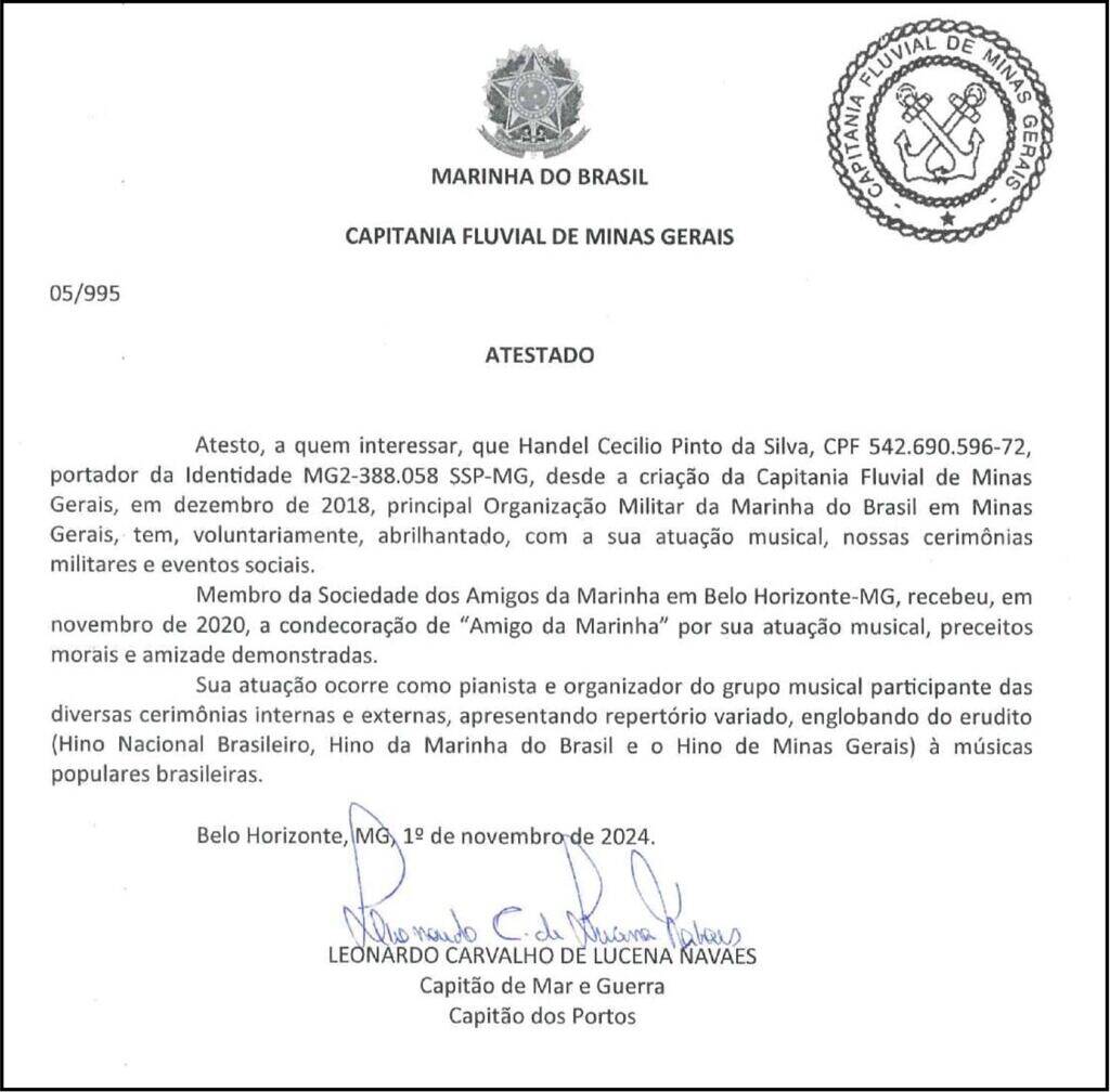 I hereby certify, to whom it may concern, that Handel Cecilio Pinto da Silva, CPF 542.690.596-72, bearer of Identity Card MG2-388.058 SSP-MG, since the creation of the Fluvial Captaincy of Minas Gerais in December 2018, the main Military Organization of the Brazilian Navy in Minas Gerais, has voluntarily brightened up our military ceremonies and social events with his musical performance. A member of the Society of Friends of the Navy in Belo Horizonte, Minas Gerais, he received, in November 2020, the award of “Friend of the Navy” for his musical performance, moral precepts and friendship. His work takes place as a pianist and organizer of the musical group participating in the various internal and external ceremonies, performing a varied repertoire, ranging from classical music (the Brazilian National Anthem, the Brazilian Navy Anthem and the Minas Gerais Anthem) to popular Brazilian songs.