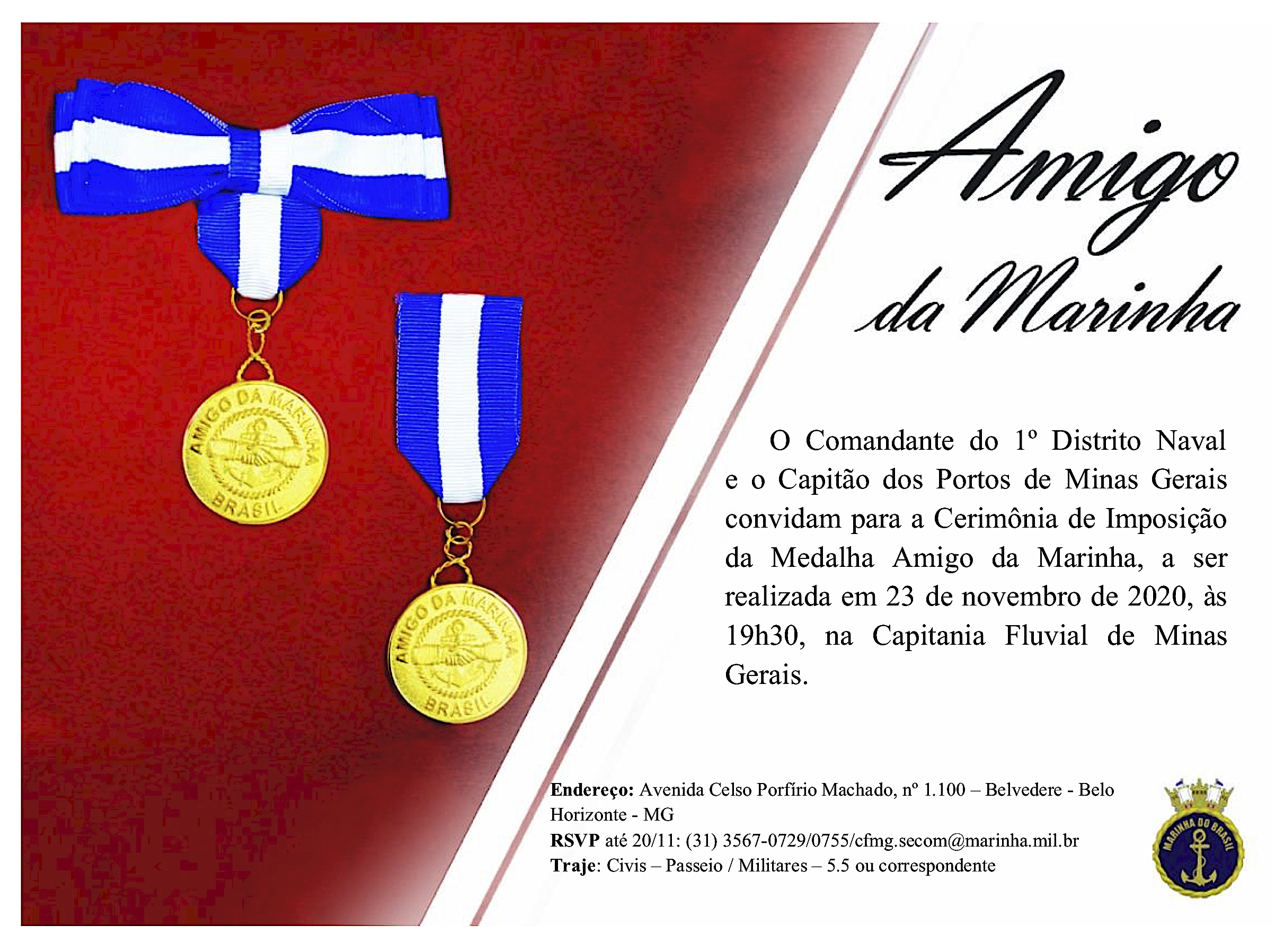 On Monday, November 23, 2020, one day after the Musician’s day, I had the honor of being awarded the “Navy Friend Medal”. The ceremony was promoted by the Fluvial Captaincy of Minas Gerais, in its recently opened operational headquarters in the capital of Minas Gerais, commanded by the first Captain of the Ports of Minas Gerais, Captain of Mar e Guerra, Nicácio Satiro de Araújo. There were moments of great joy and meaning, with precious friends, in a very pleasant environment.