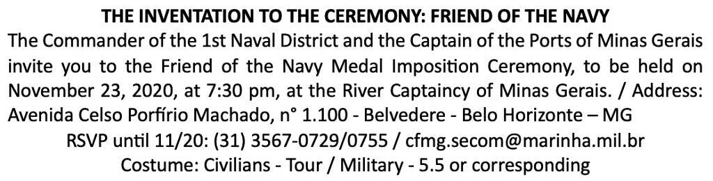 Receiving this honor by the Brazilian Navy, one of the branches of the Armed Forces of Brazil (also composed by the Brazilian Army and the Brazilian Air Force), in recognition of my work as a musician, and for the friendship and coexistence with the Fluvial Captaincy of Minas Gerais since its foundation on December 5, 2018, has great significance for me. This receiving “Medal Amigo da Marinha” at this ceremony was a very significant and exciting moment in my life. I thank the musician friends who very kindly accepted to participate in this event: Santiago Tostes (piano) and Annelise Cavalcanti (soprano). I am also grateful to everyone in this Captaincy for their friendship, for their kindness and warmth as we are always received. Especially to friends Captain of Sea and War, Nicácio Satiro de Araújo, Admiral Flávio Augusto Viana Rocha (Secretariat for Strategic Affairs), Captain-Lieutenant Luciano Ivan Corrêa Duro.