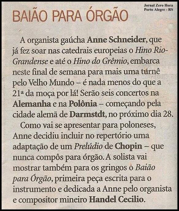 Gaucho organist Anne Schneider, who has already made the Rio-Grandense Hymn and even the Grêmio Hymn sound in European cathedrals, embarks this weekend for another tour of the Old World – it is nothing less than the girl’s 21st there! There will be six concerts in Germany and Poland – starting in the German city of Darmstdt, on the 28th.