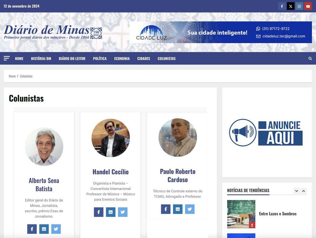 Prezados! Em outubro de 2024 fui convidado para ser COLUNISTA no Diário de Minas na área de Música e Cultura. desde então, estou publicando artigos semanalmente.