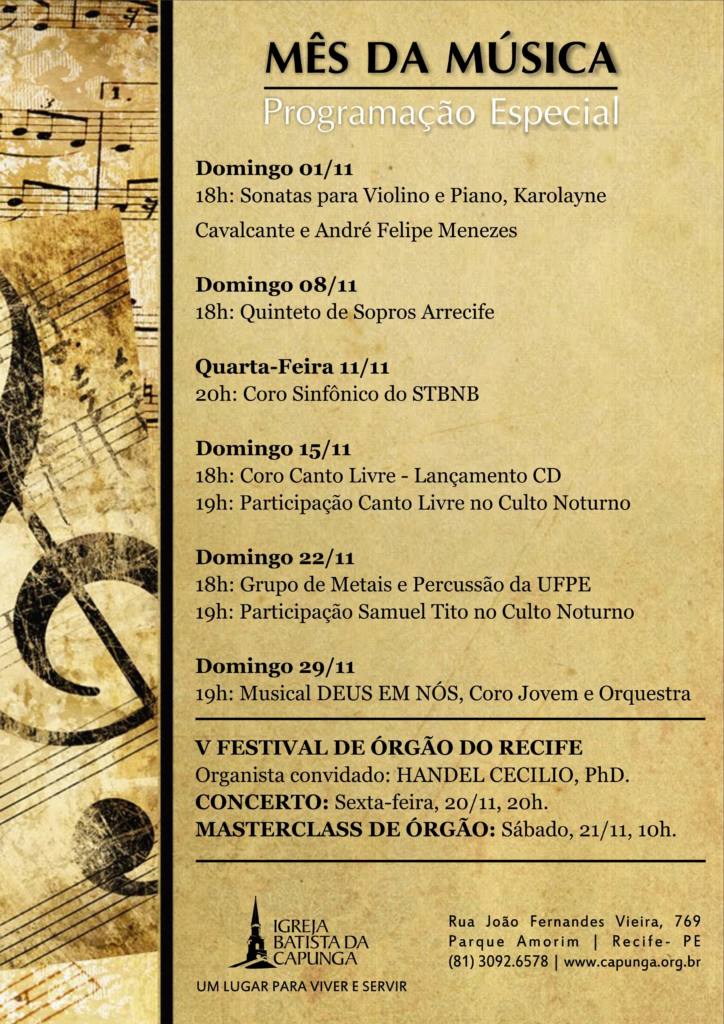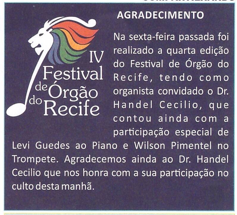 Sunday Bulletin of the Baptist Church of Capunga – Organist Handel Cecilio in the IV Festival of Organ of Recife