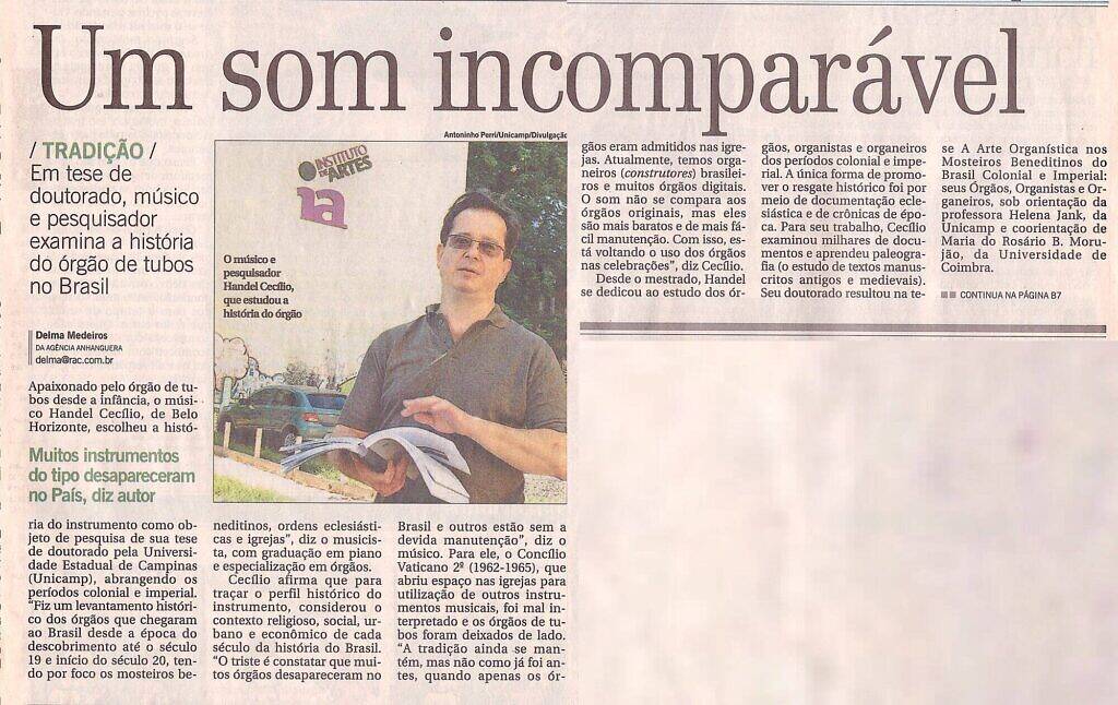 CORREIO POPULAR Newspaper: In doctoral thesis, musician and researcher examines the history of the pipe organ in Brazil