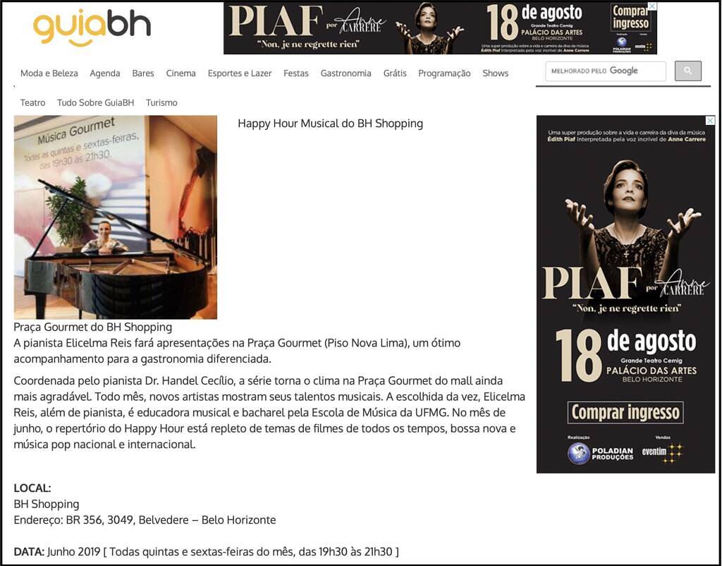The pianist Elicelna Reis will perform in the Gourmet Square (Piso Nova Lima), a great accompaniment to the differentiated gastronomy. Coordinated by pianist Dr. Handel Cecílio, the series makes the atmosphere in the mall’s Gourmet Square even more pleasant. Every month, new artists show their musical talents. The chosen one, E. Reis, besides being a pianist, is a music educator and holds a bachelor’s degree from the UFMG School of Music. In June, the Happy Hour repertoire is filled with themes from movies of all times, bossa nova and national and international pop music.