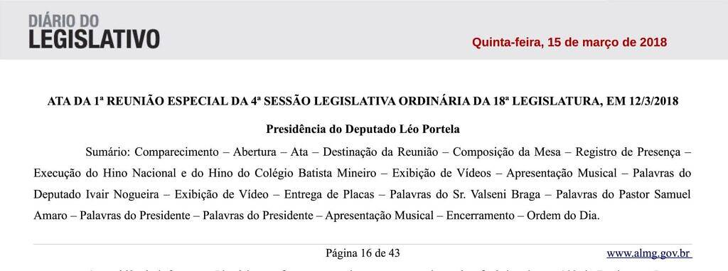 The speaker – On behalf of the deputies Léo Portela and Ivair Nogueira, we take this opportunity to thank the Centennial Choir of the Colégio Batista Mineiro for their participation in this solemnity and, in a special way, the little ones.