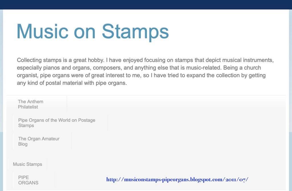 Music on Stamps is a collecting stamps is a great hobby. I have enjoyed focusing on stamps that depict musical instruments, especially pianos and organs, composers, and anything else that is music-related. Being a church organist, pipe organs were of great interest to me, so I have tried to expand the collection by getting any kind of postal material with pipe organs.