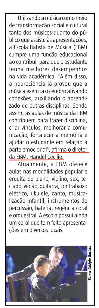 Using music as a means of social and cultural transformation for both the musicians and the audience attending the performances, the Baptist School of Music (EBM) fulfills an educational function by contributing to the student’s perform better in academic life. “In addition, neuroscience. Using music as a means of social and cultural transformation for both the musicians and the audience attending the performances, the Baptist School of Music (EBM) fulfills an educational function by contributing to the student’s performance in academic life. in academic life. “In addition, neuroscience has proven that music exercises the brain by activating connections, helping the learning of other disciplines. Therefore, EBM’s music classes contribute to bring discipline, create bonds, improve communication, strengthen memory and help the student in relation to the emotional part “, says the director of EBM, Handel Cecilio.