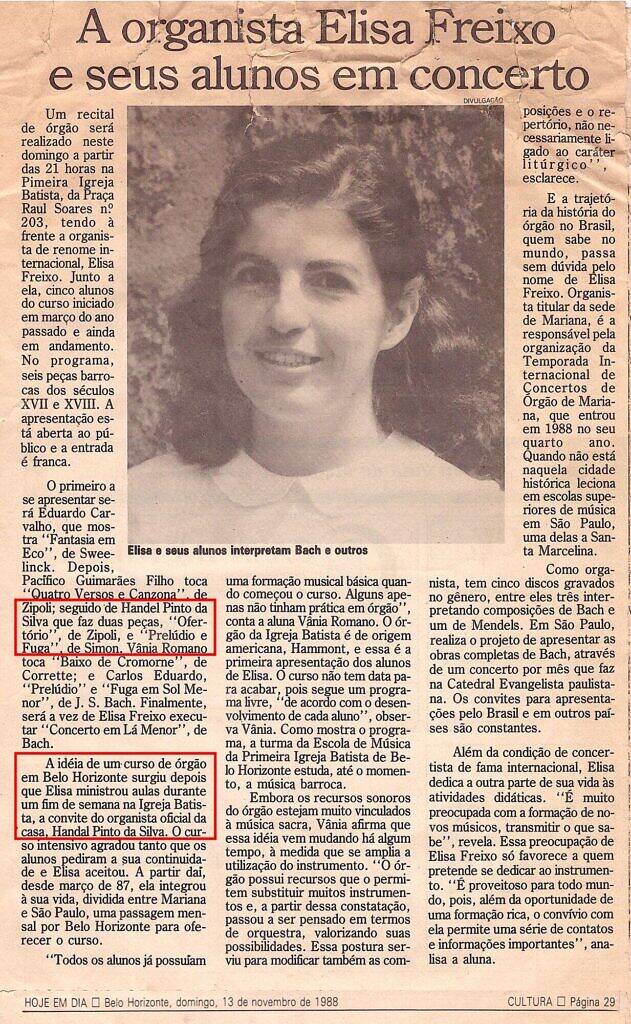 The idea of an organ course in Belo Horizonte arose after Elisa gave lessons during a weekend at the Baptist Church, at the invitation of the official organist of the house, Handel Pinto da Silva.