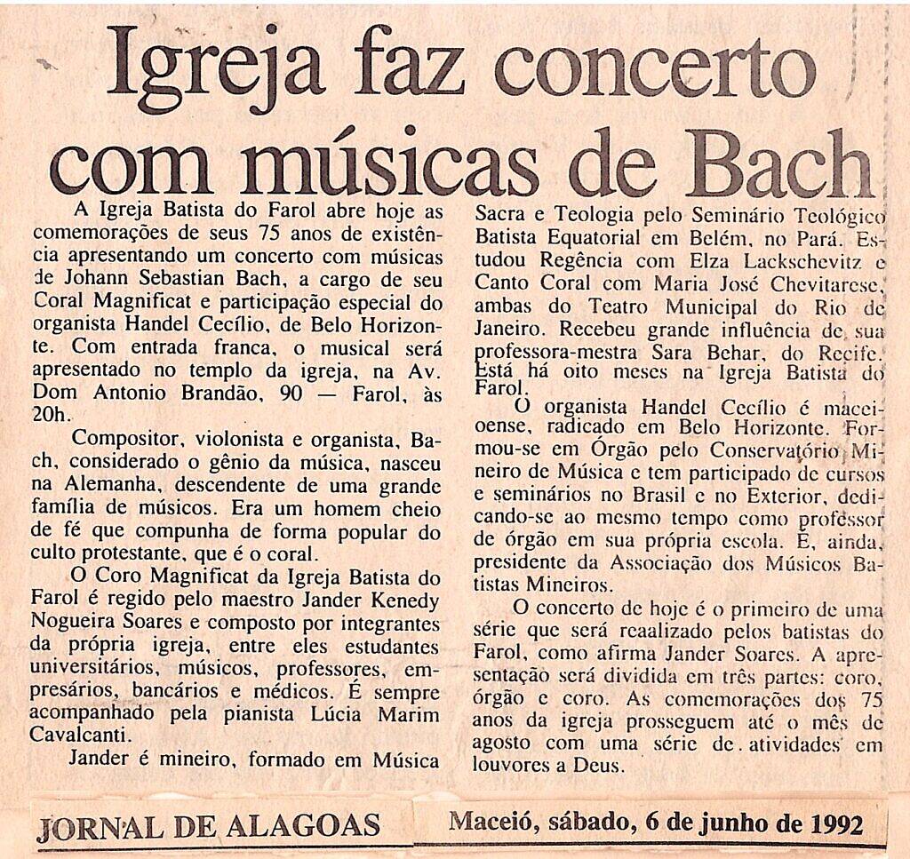 NEWSPAPER JORNAL DE ALAGOAS * Organist Handel Cecilio performs concert in the Farol Baptist Church – Brazil