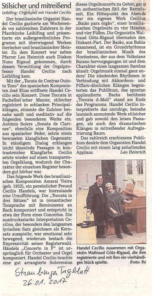 The Brazilian organist Handel Cecilio performed last Saturday in the parish of Leiblfing and presented an exceptional program with works by Iberian and Brazilian masters. Handel Cecilio began his concert with the “Tocata de Contras Quinto Tono” by the Spanish composer José Elias. This Toccata in Pachelbel’s style, elegantly recorded in elegant Principal timbres, led the audience into an almost soft and meditative state, to the following works. Antonio Soler’s “Sonata de Clarines”, also a work of Spanish penmanship, deliberately set up a tonal contrast. In a constant dialogue sounded slightly dancing passages in contrasting timbral colors. Cecilio again used a transparent organ sound in which the character of the individual registers stood out very well. The next work by the Brazilian composer Amaral Vieira (born 1952), a personal friend of Handel Cecilio, was a national premiere in this country. The “Toccata in 3 movements” was composed in a romantic musical language reminiscent of Bach and corresponds roughly to the form of the Concerto. The interpretation Handel Cecilio’s expressive interpretation, which mainly valorized the slow and lyrical tempo as the main tempo, was lyrical tempo as the main tempo, was played in a very emotional way and once again the expressiveness once again the expressiveness of the choice of registers stood out. Händel’s “Concerto in F” was originally composed for orchestra and organ. Handel Cecilio brought a very well arranged solo version of this organ concerto, totally in the authentic style of the Baroque period. A highlight of the evening was the work composed by Handel Cecilio “Baião para Órgão”, a Brazilian suite for organ for 4 hands and 4 feet. Organist Waltraud Götz-Rigaud took the discante part. Baião, originally from Bahia, is a basic rhythm of Brazilian music from the Northeast, which emerged from the popular dance of Bahia and has a character similar to that of a slow samba. Organ music in a different way! The fiery rhythms in conjunction with accordion-like timbres and Pifaro thrilled the audience, who applauded spontaneously. Bach’s famous “Toccata in D minor” was the finale of the program. Handel Cecilio played the restless, almost moody-looking work elegantly in a secure manner giving way to quieter passages as well as dramatic sounds registering excitement. The large audience thanked the organist Handel Cecilio with prolonged applause.