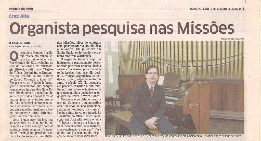 The organist Handel Cecilio, who lives in Minas Gerais and is currently in Rio Grande do Sul, works on his doctoral thesis in Historical Musicology entitled “Pipe Organs, Organists and Organists: a Treaty of their History in Colonial and Imperial Brazil” He searches the State for information and documents proving that the churches of the Seven Missionary Peoples had organs built and played by Jesuit priests and Guarani Indians. “I have already found references to the existence of pipe organs in the Jesuit reductions and I seek to prove this information,” says the musician. This is an area of the thesis that is in the initial phase of research and should advance with the contacts this week. Cecilio’s agenda includes visits to Santo Ângelo and São Miguel das Missões, as well as contacts with researchers of missionary history. He has already been to Santa Maria, where organ builder Manfred Worlitchek lives. The pipe organ is today a virtually unknown instrument because it is restricted, due to its size, mainly to churches. As a result, Cecilio says, the organ tradition was lost in Brazil, especially during the 20th century. In his research, he seeks to rescue what existed in the country about the instrument that even accompanied the squadron of Pedro Álvares Cabral. Cecilio came to the State to play at the Commemorative Concert to the 100 years of Leo Schneider, held Sunday in the Capital. This Thursday, he will speak, at 7:30 pm, at the Erico Veríssimo Museum, in Cruz Alta, on the theme “The pipe organ: an illustrious unknown gentleman, its history, its construction and its use.” He will also make commented hearing of pieces by Johann Sebastian Bach.