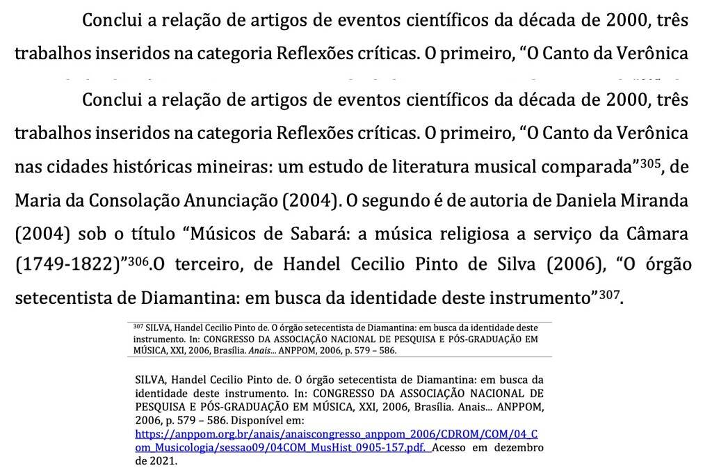 The list of articles from scientific events in the 2000s concludes with three papers in the Critical Reflections category. The first, “O Canto da Verônica nas cidades históricas mineiras: um estudo de literatura musical comparada”305, by Maria da Consolação Anunciação (2004). The second is by Daniela Miranda (2004) under the title “Musicians of Sabará: religious music at the service of the Chamber (1749-1822)”306.The third, by Handel Cecilio Pinto de Silva (2006), “The eighteenth-century organ of Diamantina: in search of the identity of this instrument”307.