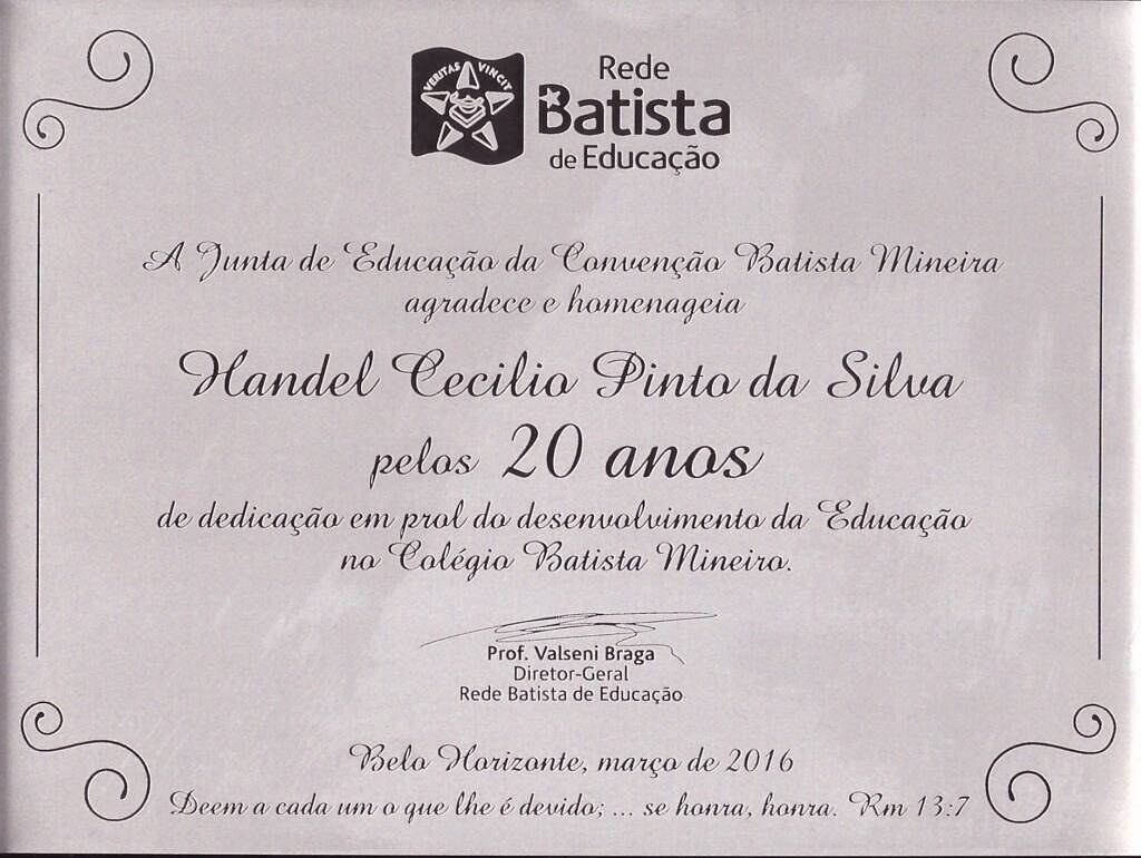 In March 2020, on the occasion of the celebrations of the 102nd anniversary of Colégio Batista Mineiro, theBoard of Education of the Batista Mineira Convention, delivers this plaque to Handel Cecilio, who in this year 2020 completed 24 years in this educational institution. the Colégio Batista Mineiro was founded on March 1, 1918 by the American missionaries Dr. Otis and Prof. Ephigênia Maddox.