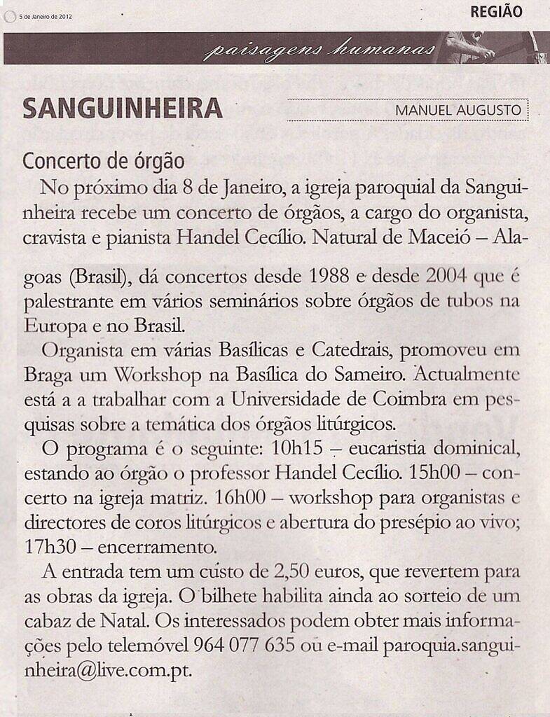 On January 8, the parish church of Sanguinheira will host an organ concert by organist, harpsichordist and pianist Handel Cecílio. Born in Maceió – Alagoas (Brazil), he has been giving concerts since 1988 and since 2004 has been a speaker at various seminars on pipe organs in Europe and Brazil.